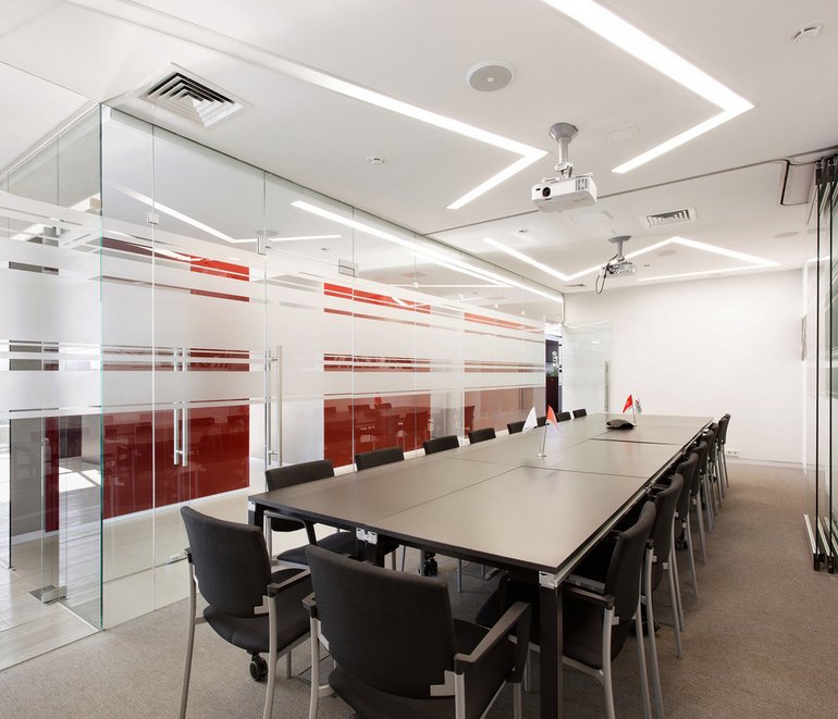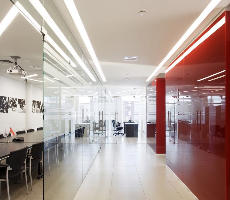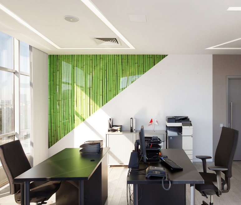 В таком офисе приятно работать, глаза меньше устают - ведь время от времени вы отрываете взгляд от рабочего стола и устремляете его в перспективу за стеклянной стеной.