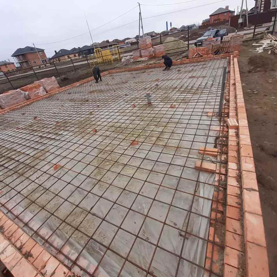После трамбовки основания в вырытый котлован закладывается арматурный каркас. Пруты арматуры могут соединяться между собой при помощи проволоки или сварки. В зависимости от этого подбирается класс арматуры. Если планируется сваривать пруты, то в номенклатуре арматуры должна присутствовать на конце буква «С», например, «А500С». В остальных случаях класс арматуры неважен. Подбираются те стержни, диаметр которых составляет не менее 12 мм.