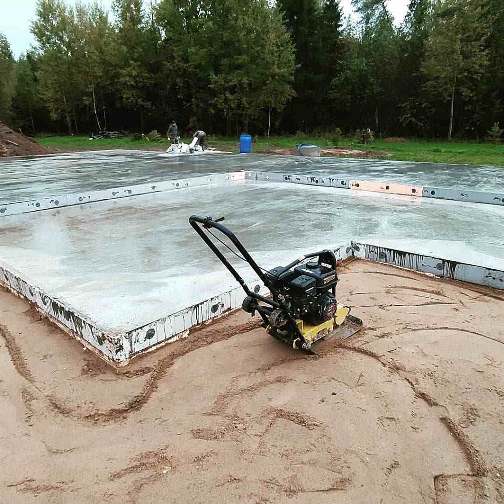 Особенностью фундамента является то, что он, в отличие от других типов, на глубину промерзания грунта не заглубляется. Перед заливкой бетонной смеси формируется основание из смеси песка с щебнем и тщательно утрамбовывается. На этом основании фундамент будто плавает, поэтому его еще называют «плавающей плитой».